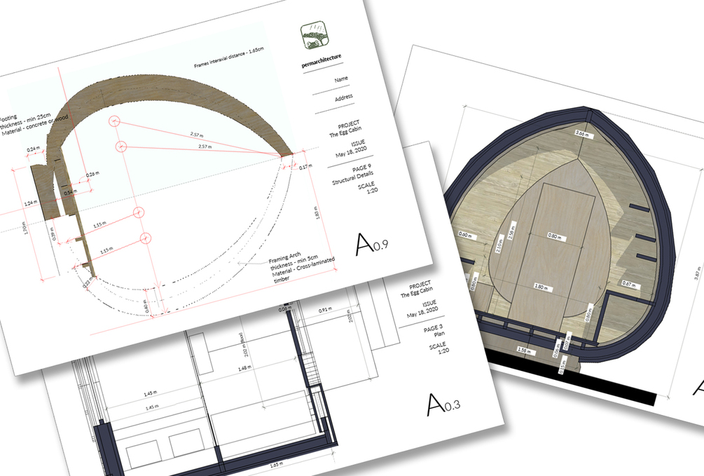 The Permarchitecture shop sells house plans that you can use off-the-shelf for your own project or with modifications. They are designed with permarchitecture design principles in mind. They are not material-specific but define a general range of possibilities. Also, they are reflective of a general bioclimatic approach, even though they lack relative positioning due to the obvious fact that they are not placed on any specific site. The trick after having acquired such a plan is then, of course, to place it on the land in such a way that it reflects those bioclimatic intentions, like placing North upwards.