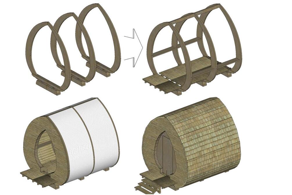 The Egg is a quirky little cabin that takes very little space. The first drafts of this project is very similar to the final thing. That comes from the clear idea behind it: a funky egg section, nesting you to sleep.