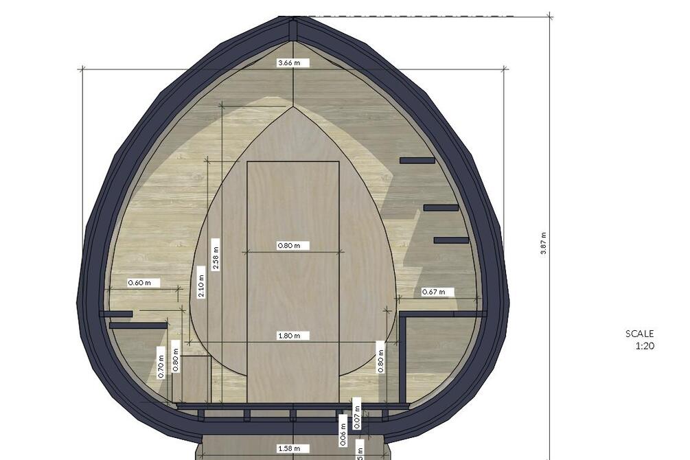 The Egg is a quirky little cabin that takes very little space. The first drafts of this project is very similar to the final thing. That comes from the clear idea behind it: a funky egg section, nesting you to sleep.