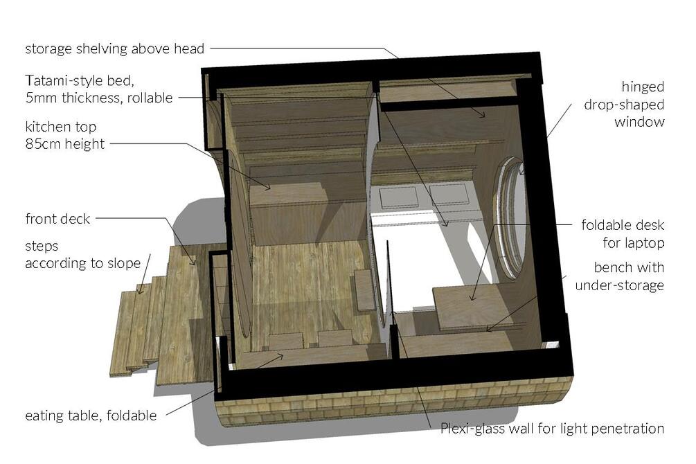 Most of the furniture is built-in and incredibly space-efficient. There are too main areas, the day and the night, divided at the middle of the cabin. The first half if the space has built-in shelves, counter tops and tables for cooking, eating and working. The second half has a reading area and storage under and above the bed.